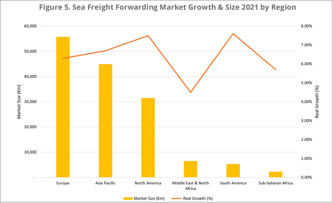 据悉,根据Ti Research近日发布的一份报告,2021年全球货运代理市场强劲反弹,实际增长11.2%,实现了自2011年以来的最高增长率,市场价值达到2849亿美元。其中亚太地区货运代理市场增长率最高,达到13.8%,总规模占全球市场的34.9%。