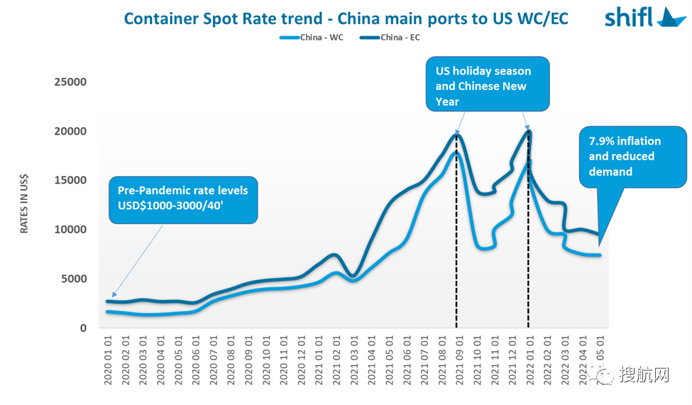“正如我们之前预测的那样,现货运价持续下降的核心原因是我们从客户数据中看到的美国需求减少。2022年4月,40英尺集装箱的价格继续下降,中国-美西降至7000-8000美元,中国-美东降至9000-10000美元左右。”Shabsie Levy说道。