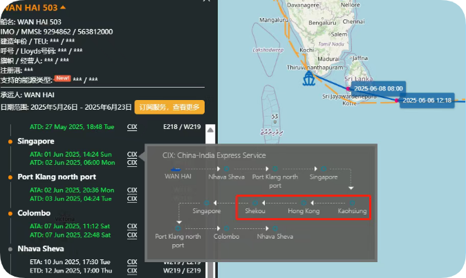 “万海503”服务于万海的中国至印度的CIX航线,事发时正在执行W219航次任务,涉及HAPAG-LLOYD、EVERGREEN、WAN HAI等船公司共舱,船上满载由高雄、香港、蛇口及新加坡中转的货物,目的港为巴生港、科伦坡和那瓦希瓦。