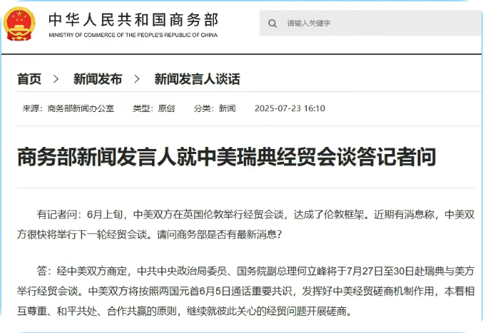 针对记者提问中美下一轮经贸会谈相关消息,商务部回应:经中美双方商定,中共中央政治局委员、国务院副总理何立峰将于7月27日至30日赴瑞典与美方举行经贸会谈。双方会依照两国元首6月5日通话的重要共识,利用好中美经贸磋商机制,秉持相互尊重、和平共处、合作共赢原则,就彼此关切的经贸问题展开磋商 。商务部新闻发言人就中美瑞典经贸会谈答记者问有记者问:6月上旬,中美双方在英国伦敦举行经贸会谈,达成了伦敦框架。近期有消息称,中美双方很快将举行下一轮经贸会谈。请问商务部是否有最新消息?答:经中美双方商定,中共中央政治局委员、国务院副总理何立峰将于7月27日至30日赴瑞典与美方举行经贸会谈。中美双方将按照两国元首6月5日通话重要共识,发挥好中美经贸磋....