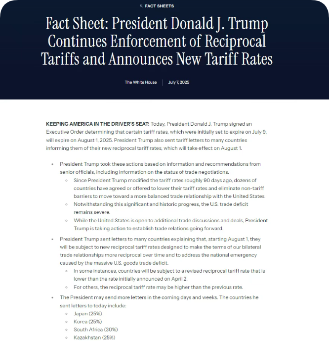 当地时间7月7日,美国总统特朗普签署行政令,将从2025年8月1日起对来自14个国家的进口产品征收关税,具体税率如下:日本、韩国、哈萨克斯坦、马来西亚、突尼斯为25%;波黑、南非为30%;印度尼西亚为32%;孟加拉国、塞尔维亚为35%;柬埔寨、泰国为36%;老挝、缅甸为40%。依赖对美出口的东南亚成高税率重灾区。特朗普通过社交媒体平台“真实社交”网站,陆续发布了写给这14国领导人的信函,阐述征税理由。他表示新关税将独立于各类行业性关税。在信中,特朗普警告称,若这些国家提高对美关税,美国将在现有新关税税率基础上追加同等幅度关税;任何试图通过第三国转运来规避新关税的做法,将被征以更高关税;若这些国家或其企业决定在....